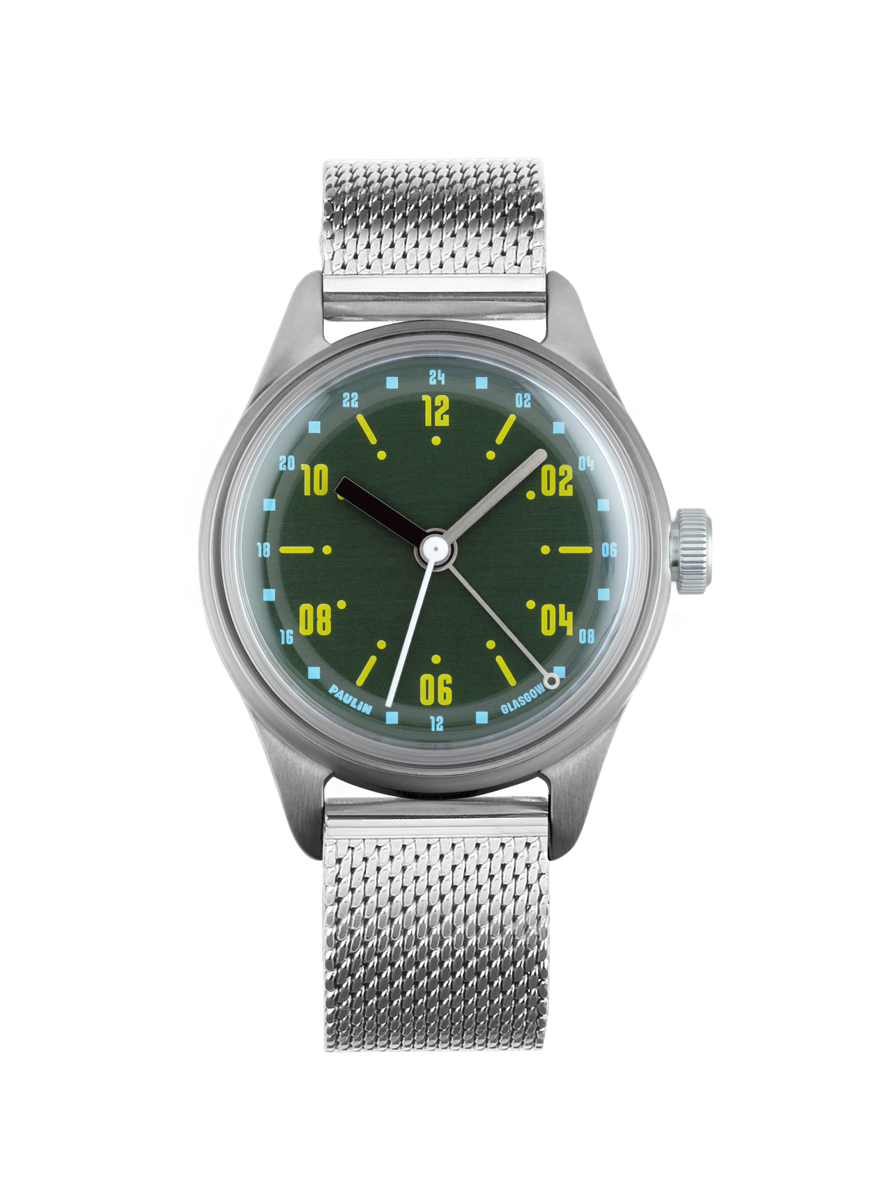 With its vivid colour palette, bespoke typography and raised box-section crystal, the Neo GMT has an evocative vintage aesthetic. The dial is manufactured in the UK using aluminium, which is anodised and dyed, imbuing the metal with an incredible depth of colour and a distinctive, almost holographic finish. Anodised aluminium is a rarity in watchmaking due to the difficulty in producing a uniform finish. The automatic watch is powered by the robust Seiko NH34A, modified to remove the ghost-date position. The movement is viewable through the optional display caseback. At a comfortable 38mm case size, the Neo suits most wrist sizes.