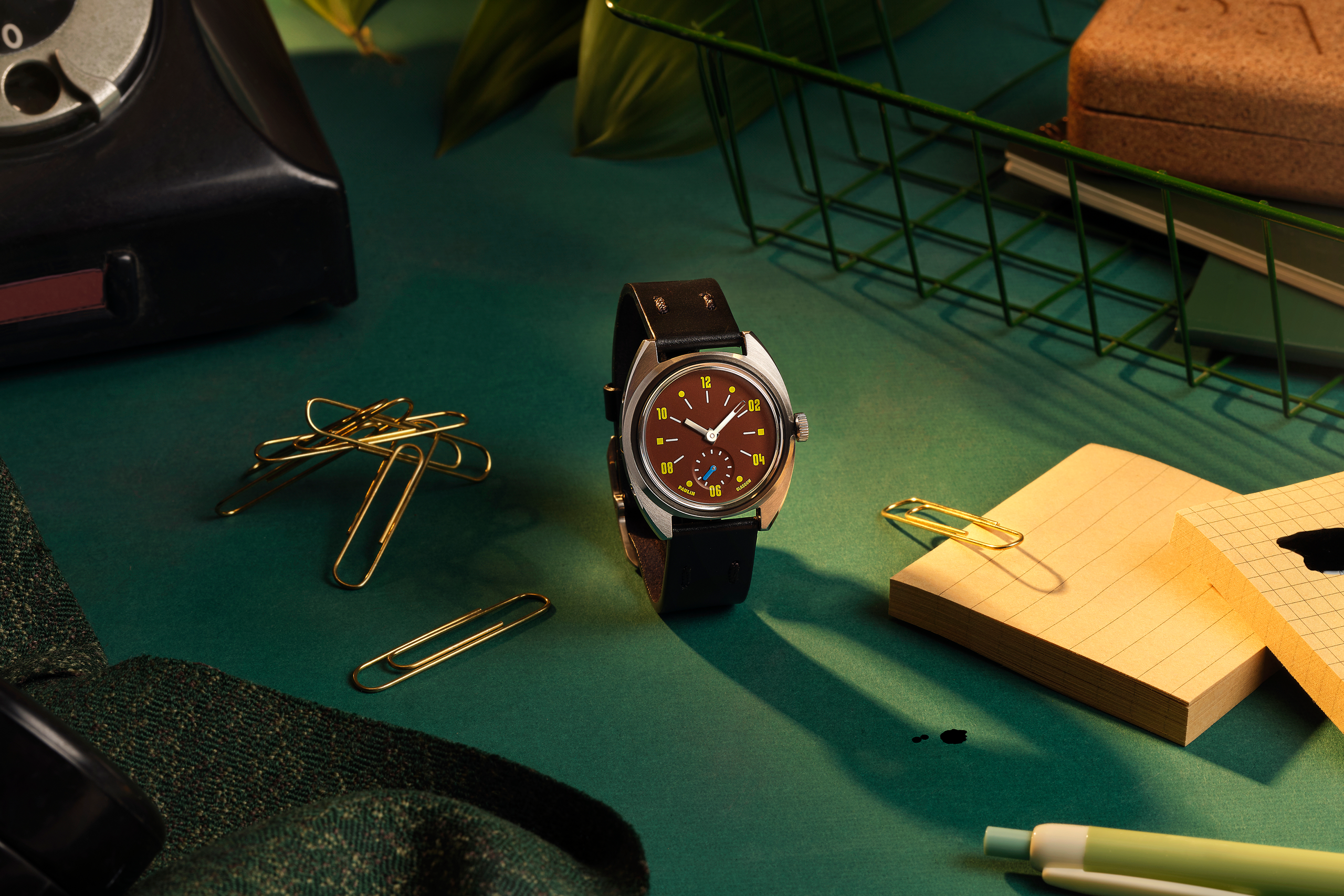 The compact and slim Modul features a bold colour palette and sleek tonneau-shaped case with a dual finish. The name comes from its modular construction, which is designed to accommodate different movement calibres. The black steel body that houses the movement is distinct from the brushed steel outer case and attached with two screws on either side. Powering the watch is a reliable ETA 7001, with striking blued screws and Geneva stripes.