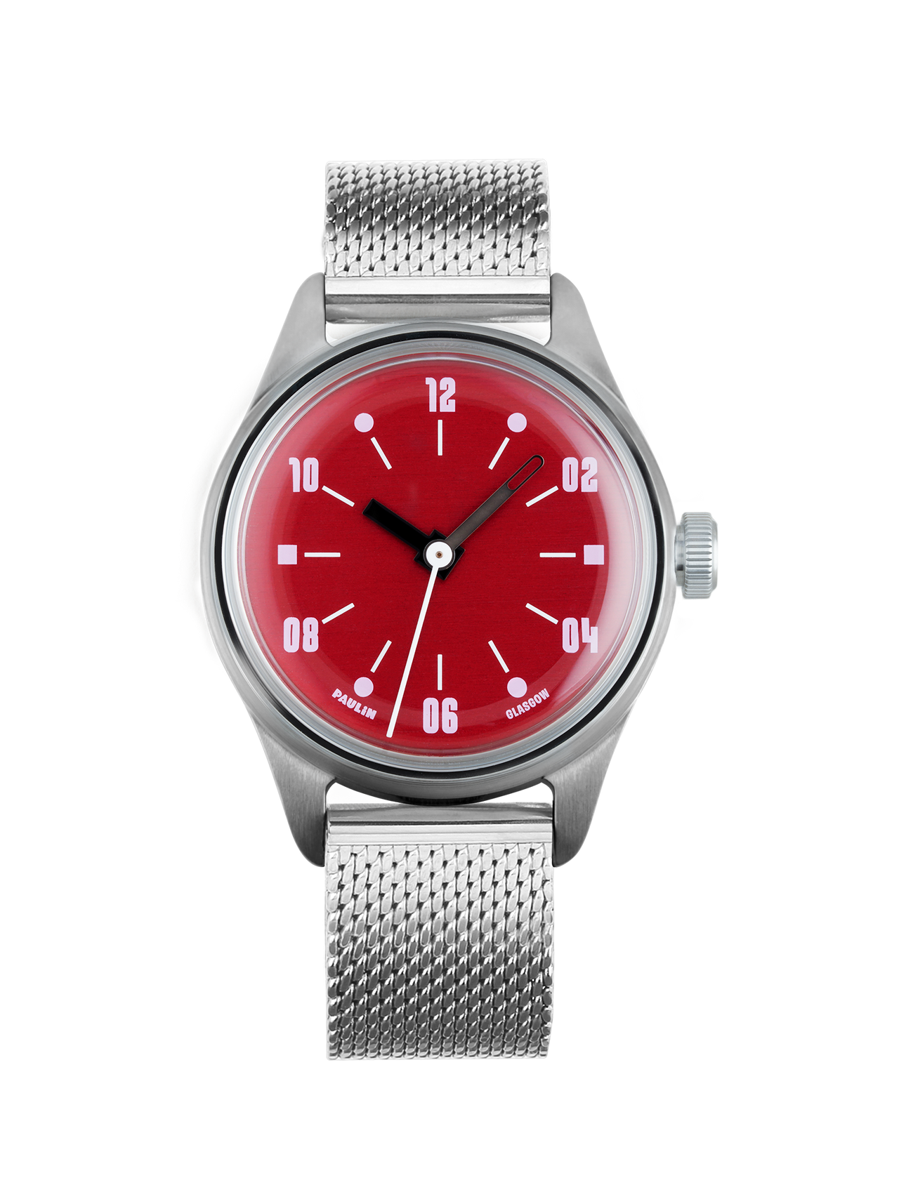 With its vivid colour palette, bespoke typography and raised box-section crystal, the Neo has an evocative vintage aesthetic. The dial is manufactured in the UK using aluminium, which is anodised and dyed, imbuing the metal with an incredible depth of colour and a distinctive, almost holographic finish. Anodised aluminium is a rarity in watchmaking due to the difficulty in producing a uniform finish. The automatic watch is powered by the robust Seiko NH35A, modified to remove the ghost-date position. The movement is viewable through the optional display caseback. At a comfortable 38mm case size, the Neo suits most wrist sizes.